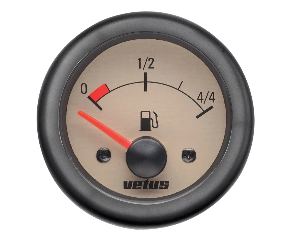 Fuel Level Indicator, White, 12/24V, Cut-Out Size diameter 52 Mm (Excl. Sensor). The range of VETUS gauges received an update; the gauges are more accurate and the bezels are redesigned and of higher quality. Dials are translucent and are illuminated by dimmable LEDs from below, offering the best possible readability. There is a choice between yellow or red illumination. The gauges are double glazed to minimise condensation and come with two different bezels: one solid black and one premium chrome. All gauges except the tachometer are 63 mm diameter (cut-out 52 mm). The rudder angle indicator is also available in this diameter as well. These standardised dimensions ensure you can easily replace your existing gauges with one from VETUS. All gauges are backwards compatible, only the tachometer requires a plug adapter.