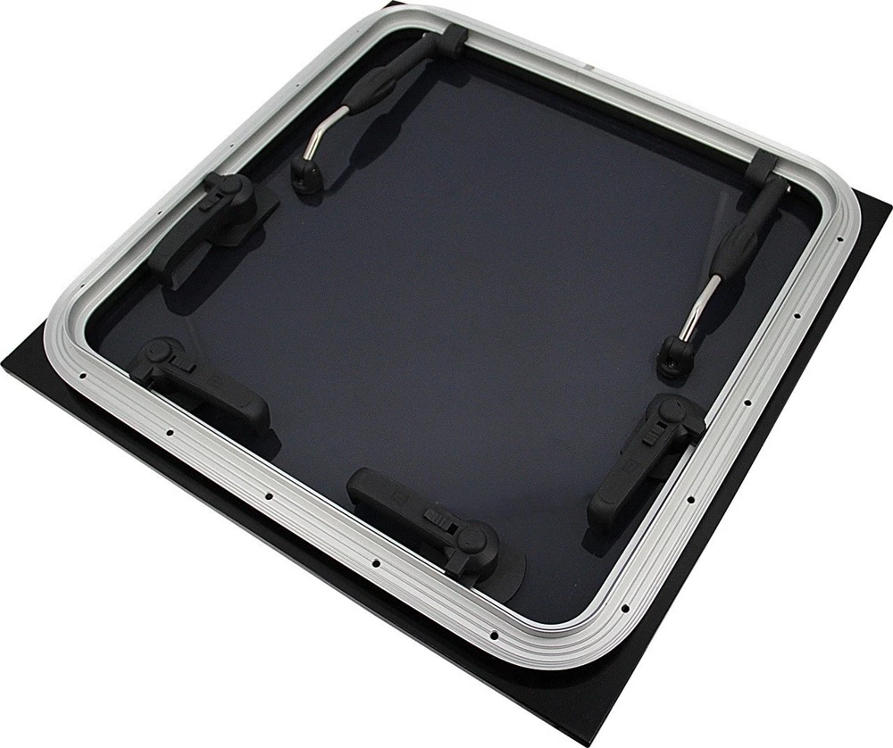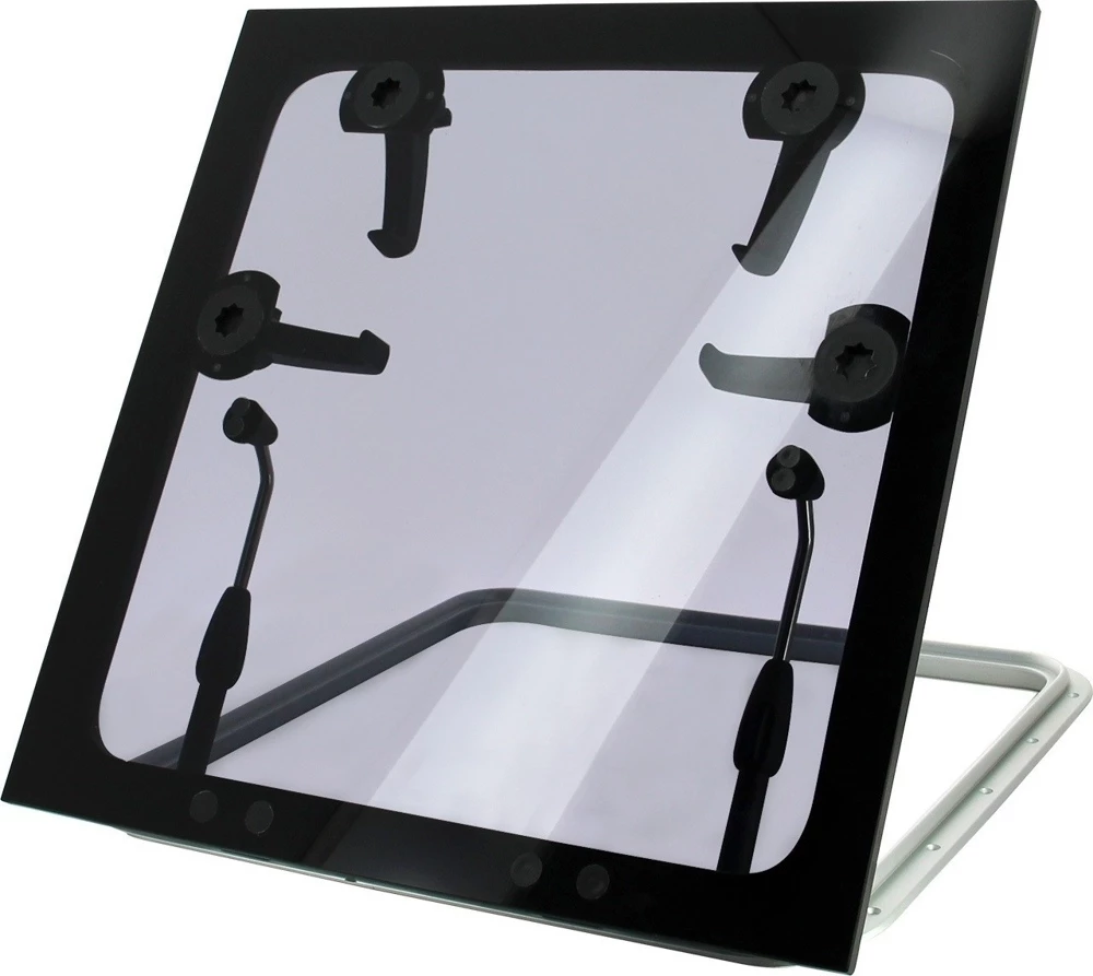 FGHF hatches are specifically designed for modern type boats. The meticulously engineered construction of these hatches ensures a flush fitting into the deck, resulting in a silky smooth transition between hatch and deck. The 12 mm thick dark smoke’ acrylic gives that VIP-privacy-glass’ vibe, while the polished and anodized aluminum frame completes the classy and time-less design on the inside. The FGHF series distinguishes itself from the FGH series by having flush mounted handles, stays and hinges in the acrylic so nothing protrudes. On that perfectly flat surface, no lines will get caught. The larger sizes hatches are equipped with a socket in the handle, so they can be opened from the outside with the help of a winch handle. The flush design reduces wind noise and is easy to clean. The VETUS clamps close the hatch tightly, making this hatch suitable for design category A, area II locations. The polished and anodized aluminium frame is both stylish as maintenance-free. FGHF hatches are engineered for cut-outs with a corner radius of 43 mm and are available from stock in the dimensions mentioned below. Unique features