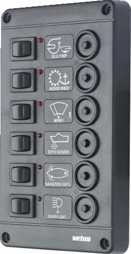 Panel with 6 on/off switches, 6 monitoring LEDs, 6 fuses of 10 A.